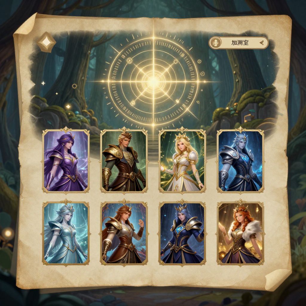 Digital fantasy card game interface showing six illuminated character portraits with magical armor, set against a mystical forest backdrop.
