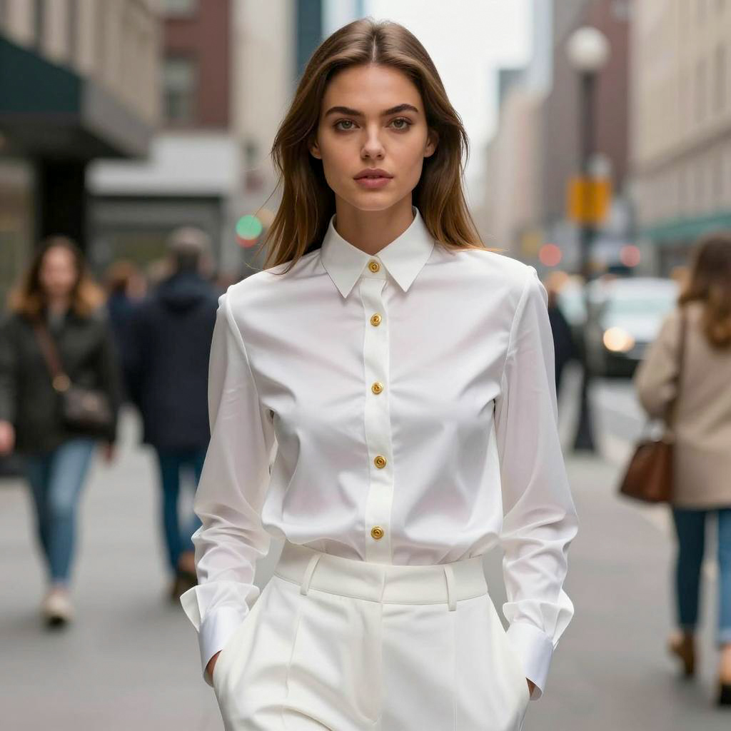 Elastigirl costume white, photorealistic portrait of a young woman, standing in an urban street, daytime, white satin long-sleeve button-up shirt, gold buttons, high collar, hands in pockets, straight brown hair, green eyes, light makeup, neutral expression, blurred background with people and buildings, soft lighting, cityscape, modern fashion, realistic ures, high detail, narrow depth of field