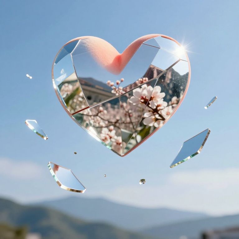 Expression The sky, a peach heart flying in the sky, memory fragments, mirror fragments in the air, reflecting spring, mountains and seas, sunlight, silver tiles, refraction, reflection,