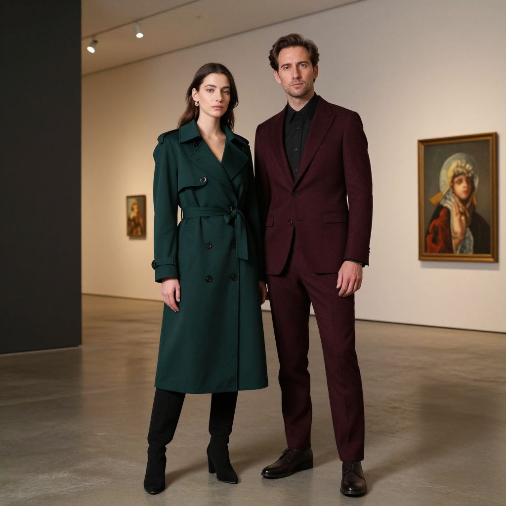 A stylish couple stands in a contemporary art gallery, the woman in a deep emerald green trench coat and the man in a rich burgundy wool suit, their coordinated yet contrasting colors highlighting the sleek architecture of the space, with soft ambient lighting emphasizing the stylish contrast between the deep hues.