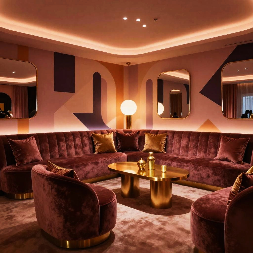 Luxurious Kelly Wearstler designed Playboy penthouse with statement lighting fixtures, rich dark tones, eye-catching abstract art, plush seating areas, blending retro glamour with contemporary chic style