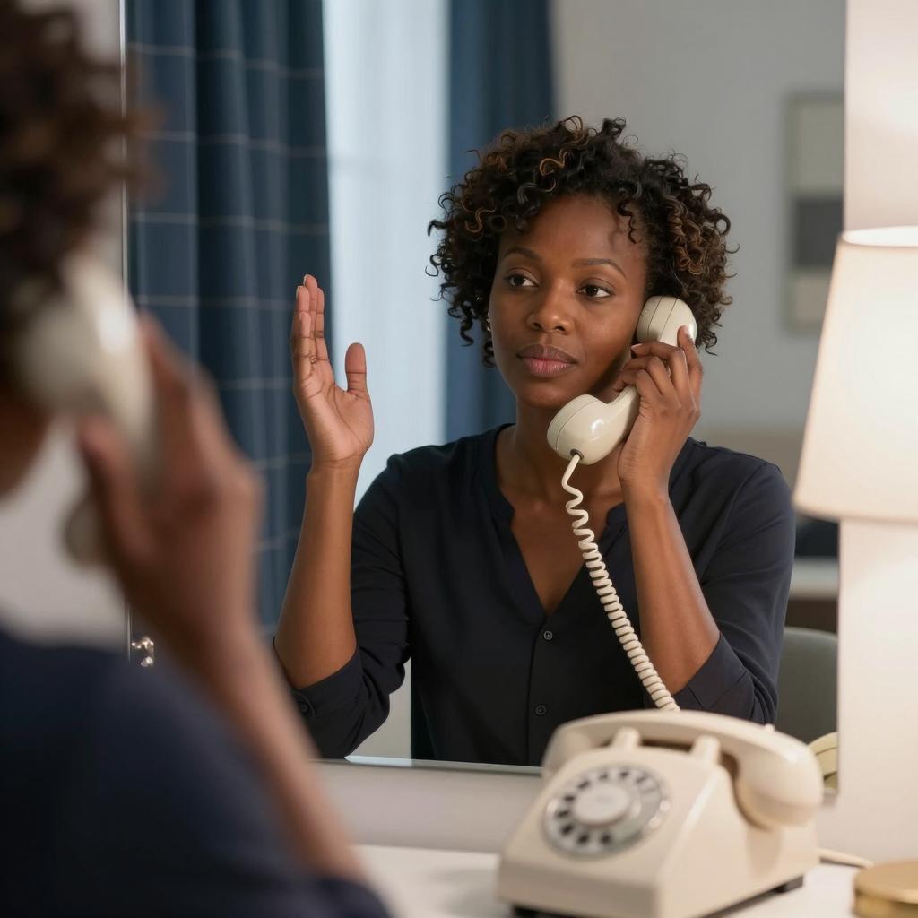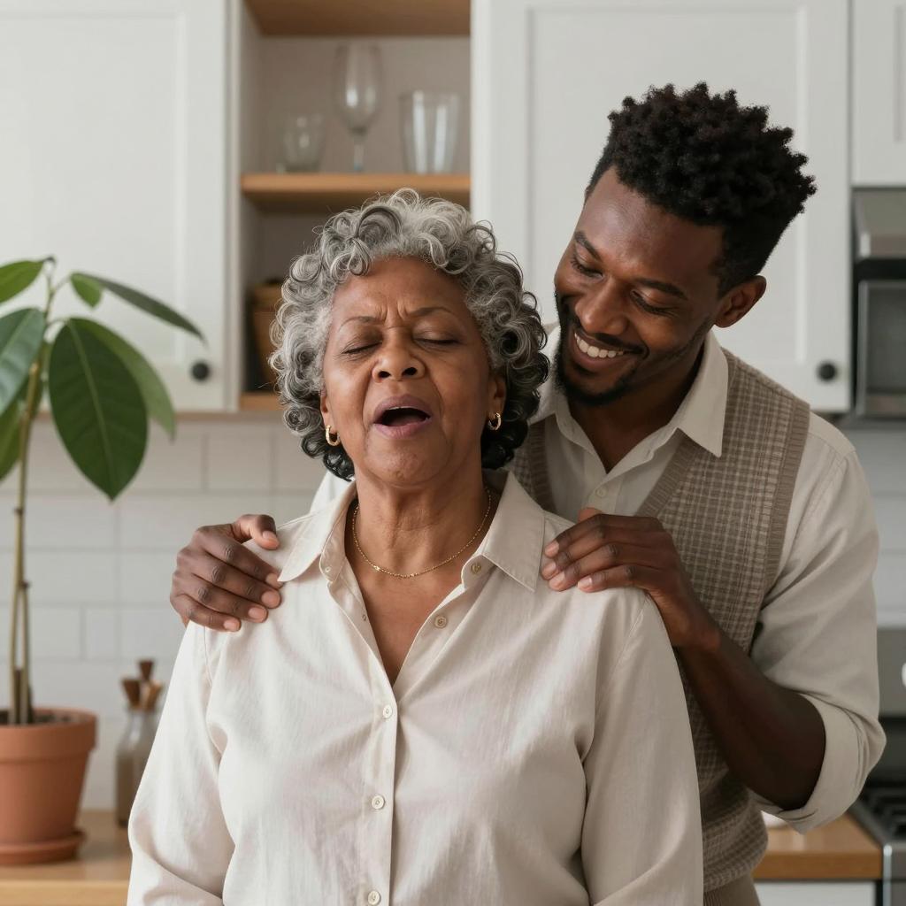 Photograph of two African-American women in a kitchen. The woman on the left has short brown hair, wears a striped shirt, and kneads dough on a marble countertop. The woman on the right has curly hair, wears a red tank top, and stands leaning against the counter. Bowls, wooden utensils, and a silver pot are on the countertop. Wooden window blinds and potted plants are in the background. The woman on the left looks at the woman on the right with a focused expression.