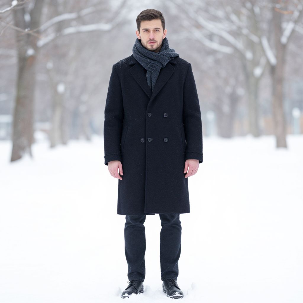 "Winter Outfit Man Costume, man in a coat and scarf standing in the snow"