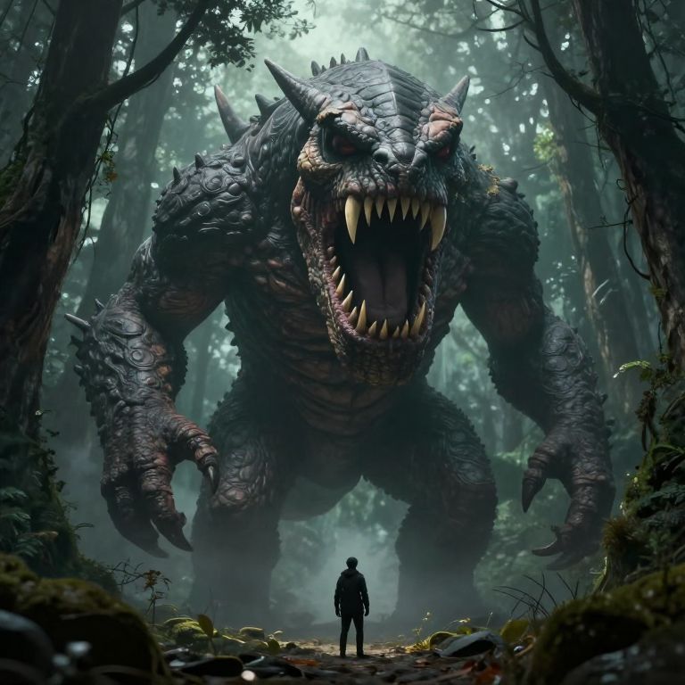 A hyper-realistic, ultra-detailed illustration of a giant, carnivorous monster with sharp features and mandibles, standing in a dark, misty forest, with a lone figure facing it.
