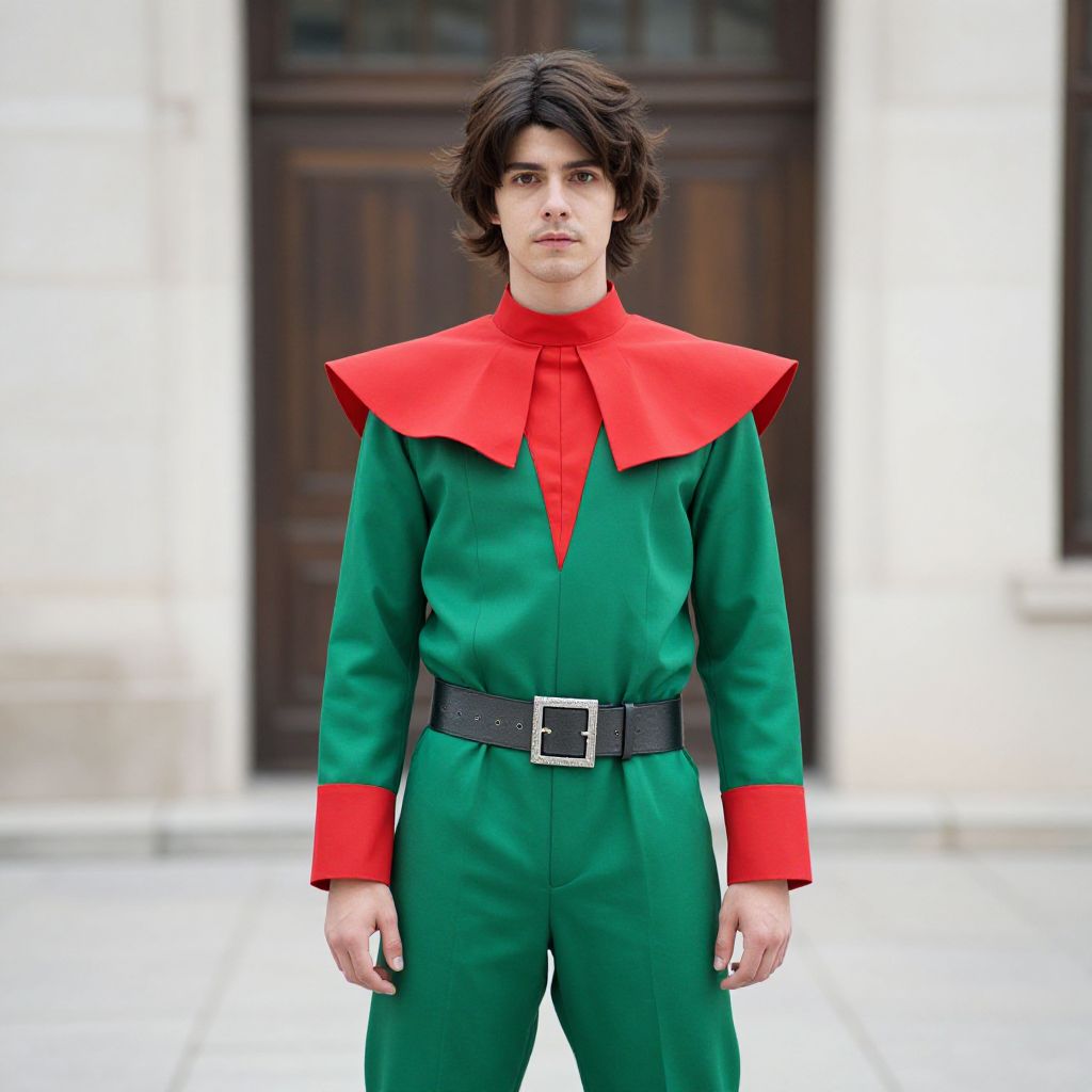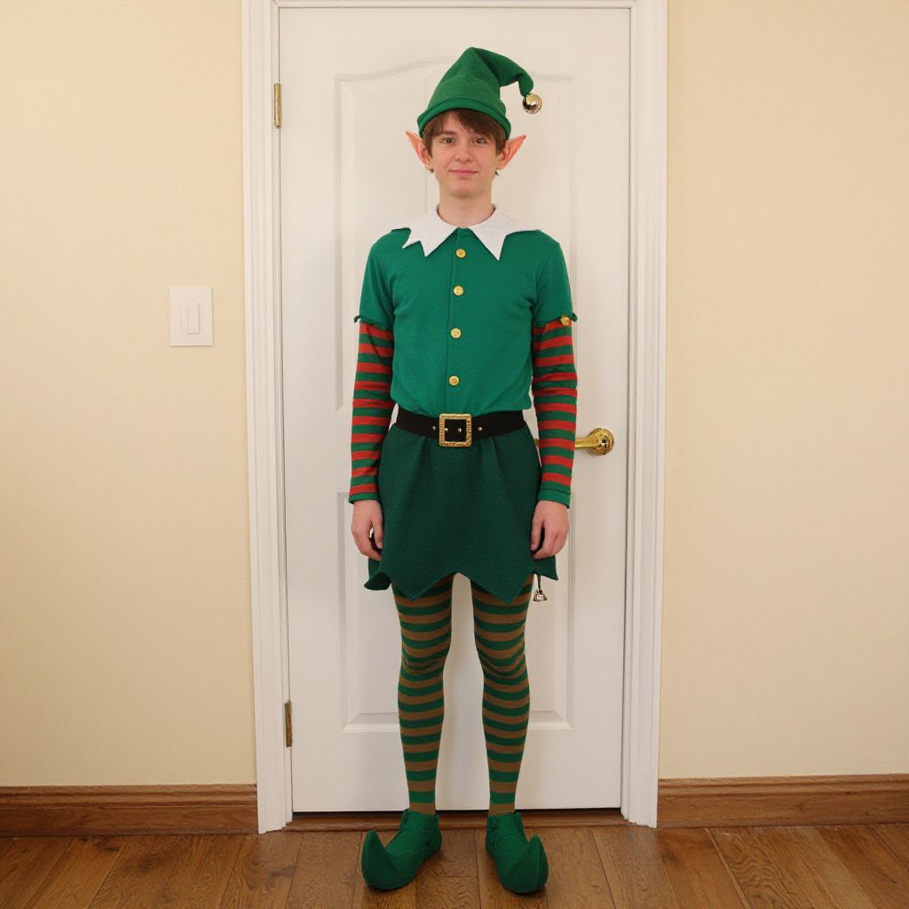 Photograph of a young man with pale skin, elf costume: green pointed hat, striped shirt, green pants, brown boots, standing against beige wall