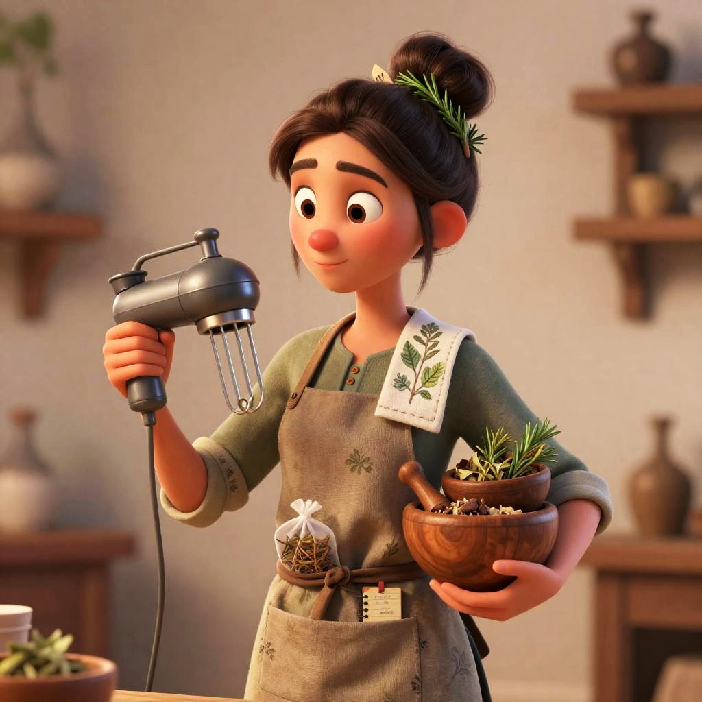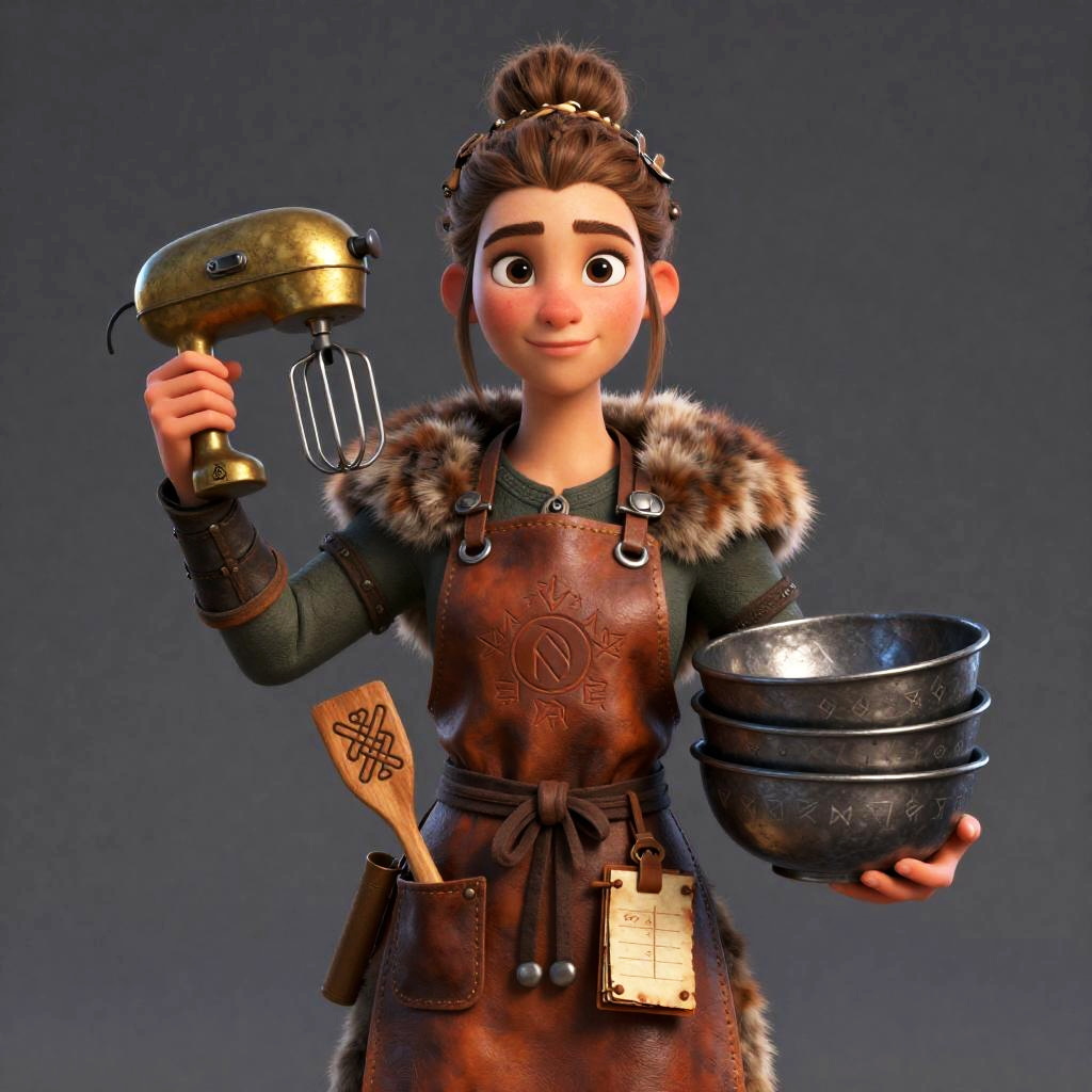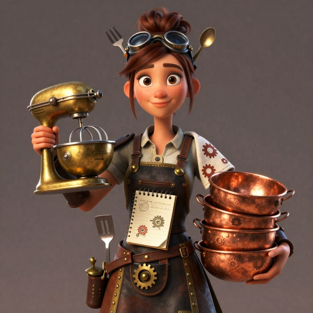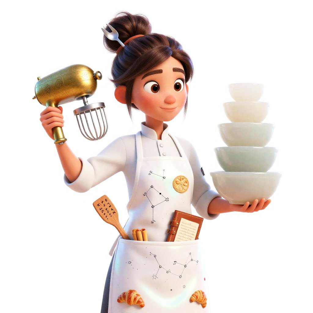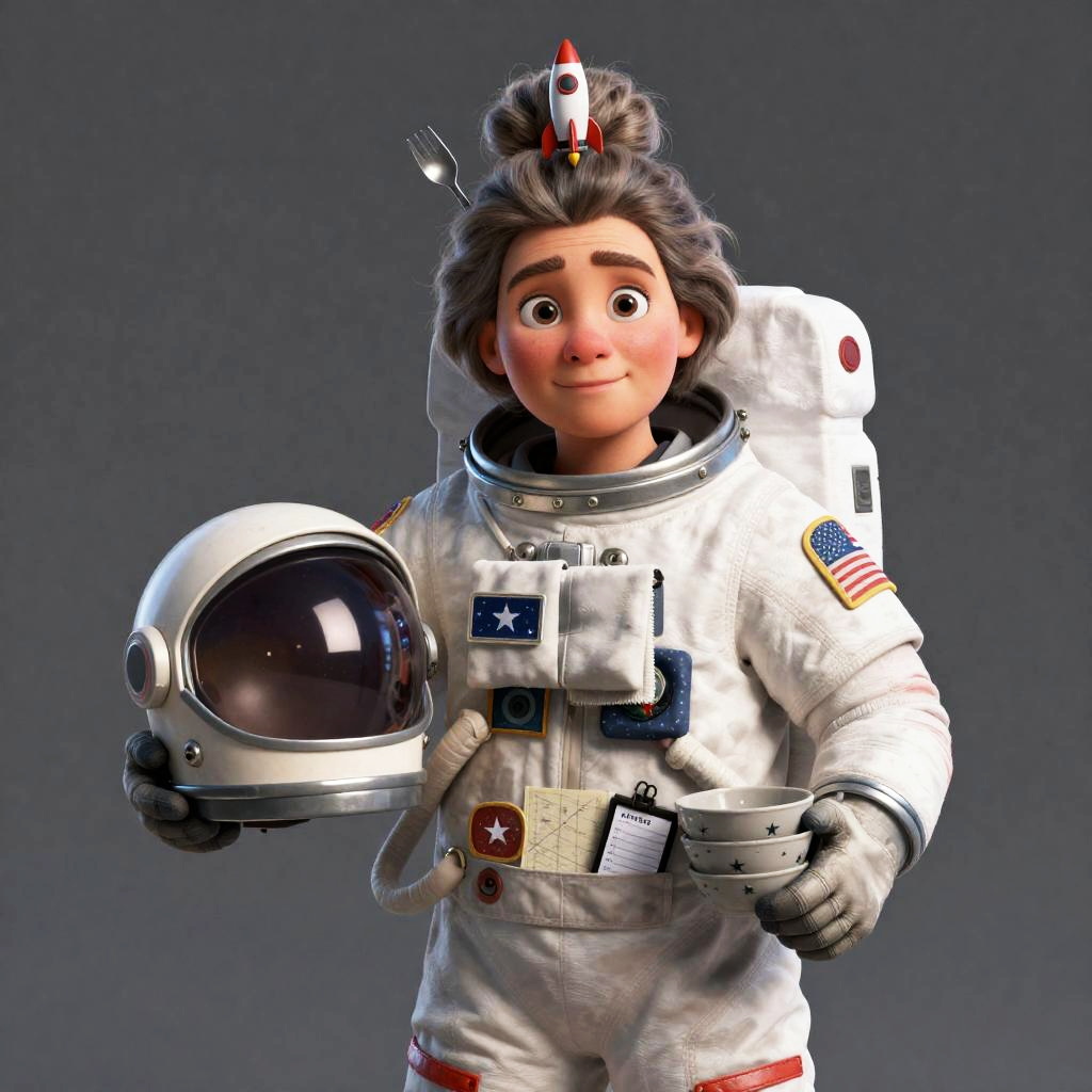 A retired astronaut depicted in a whimsical 3D animation. She wears a worn flight suit patched with mission badges and has a messy bun with a tiny model rocket plus a fork and spoon tucked in. In one hand, she holds a vintage space helmet repurposed as a mixing bowl while her other arm supports a stack of star-patterned mixing bowls. Her apron pockets contain a folded miniature star chart and a small digital notepad with mission logs, with a galactic-patterned kitchen towel draped over her shoulder, all in ultra-detailed 4K, HD quality.