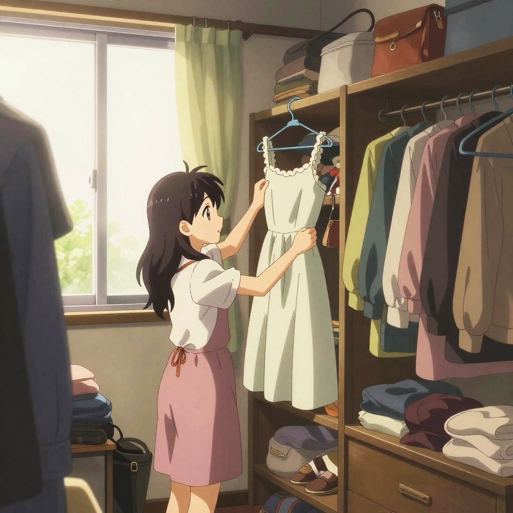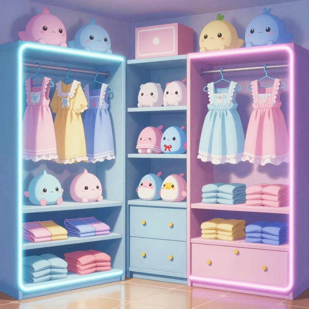 Anime closet interior with rows of unique costumes, sparkling decorations, subtle futuristic elements, high contrast shading, vibrant colors, immersive, detailed environment