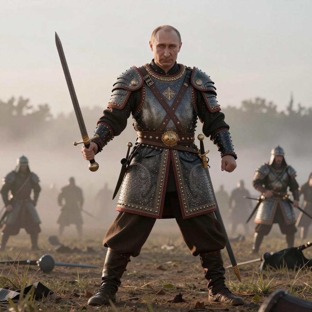 Putin costume, stylized historical warrior gear from medieval Russia, embellished with swords and armor, fierce stance on a misty battlefield at dawn, dramatic shadows