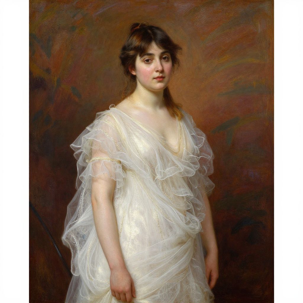 A classical oil painting reminiscent of William Bouguereau's style, featuring a woman in a delicate white gown with ruffled details, set against a richly textured background with warm, natural lighting that highlights her poised demeanor and the intricate fabric textures.