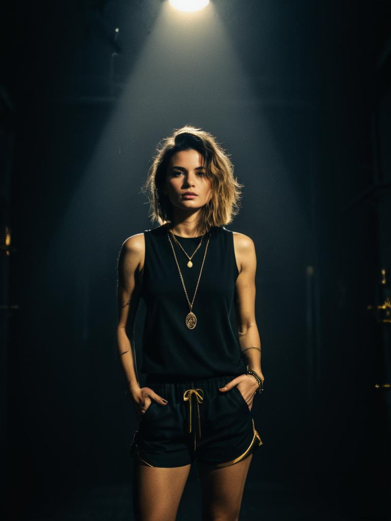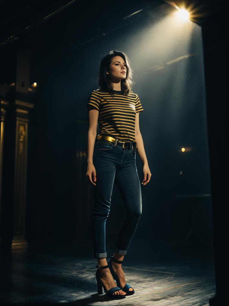 Portrait of a young woman standing in a dimly lit space illuminated by a single spot light. She wears a black and mustard yellow striped short-sleeve crew neck t-shirt tucked into slim-fit, mid-rise blue denim jeans with cuffed hems, paired with black strappy heeled sandals. The setting appears moody and artistic with dark surroundings and light particles visible in the air.