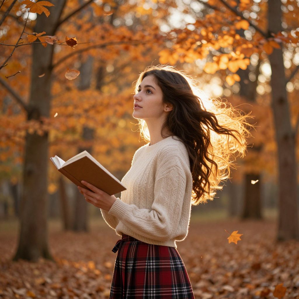 A young woman with long dark hair stands in an autumn forest surrounded by orange and brown fallen leaves. She is wearing a cream knit sweater and a red plaid skirt. She holds an open book in her hands, bathed in warm golden sunlight filtering through the trees with falling leaves around her.