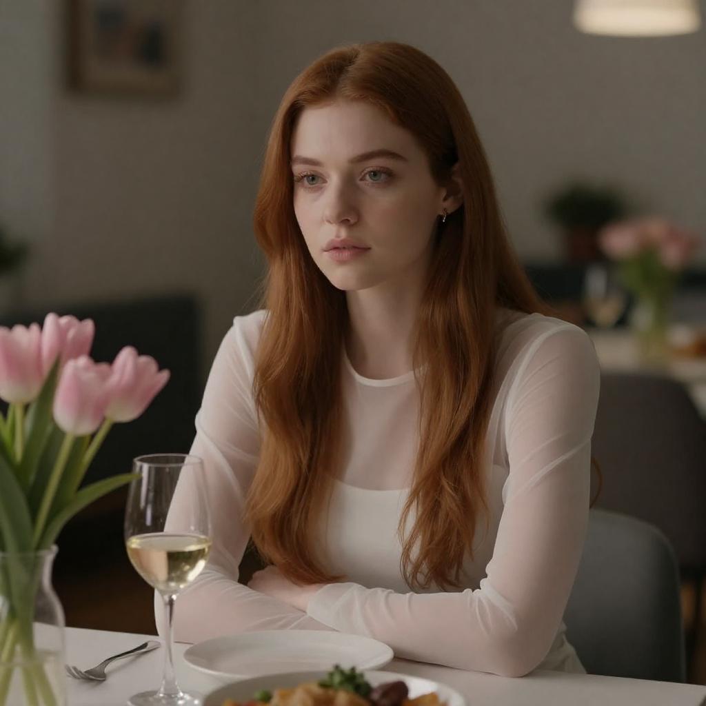 Photograph of a blonde woman with light skin and a slim build, wearing a white short-sleeve shirt, sitting at a dimly lit dining table. She has a relaxed smile, her hair in a low ponytail, and is holding a fork over a plate of food. A glass of red wine is in front of her. Warm candlelight in the background creates a cozy atmosphere.