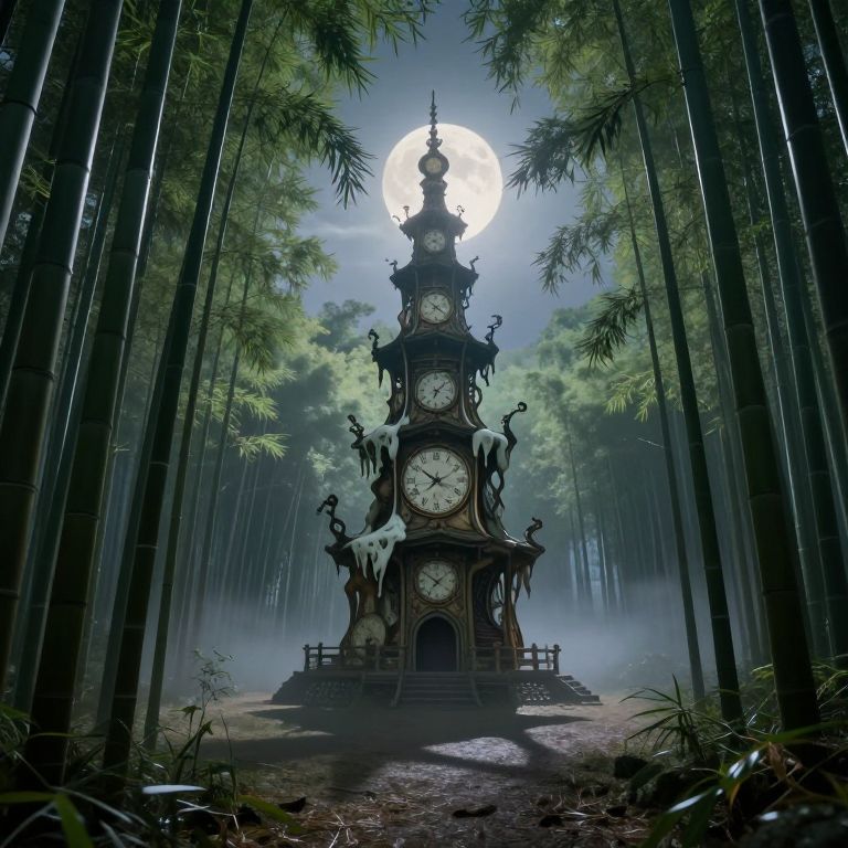 Visualize a surreal landscape, where a grand tower rises from the heart of a misty Japanese bamboo forest bathed in moonlight. This enigmatic structure, with its intricate and melting timepieces, evokes the whimsical essence of Dalí's dreamscapes. The tower casts elongated shadows that interact playfully with the surrounding bamboo grove, creating an otherworldly contrast between fantastical architecture and serene nature. Soft moonbeams filter through the dense foliage, highlighting the delicate balance between the tower's mysterious allure and the tranquil beauty of this enchanting scene, stirring a sense of wonder and introspection within the observer.