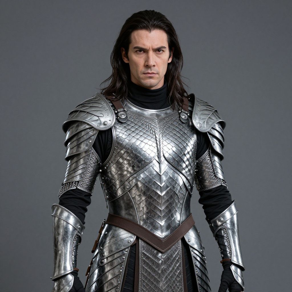 A photograph of a serious-looking man with long, dark brown hair standing against a gray background. He's wearing intricate, shiny silver armor with overlapping scales and metallic shoulder plates. His black turtleneck is visible under the armor. His gaze is intense, and his posture is strong and confident. The lighting highlights the metallic texture of his armor.