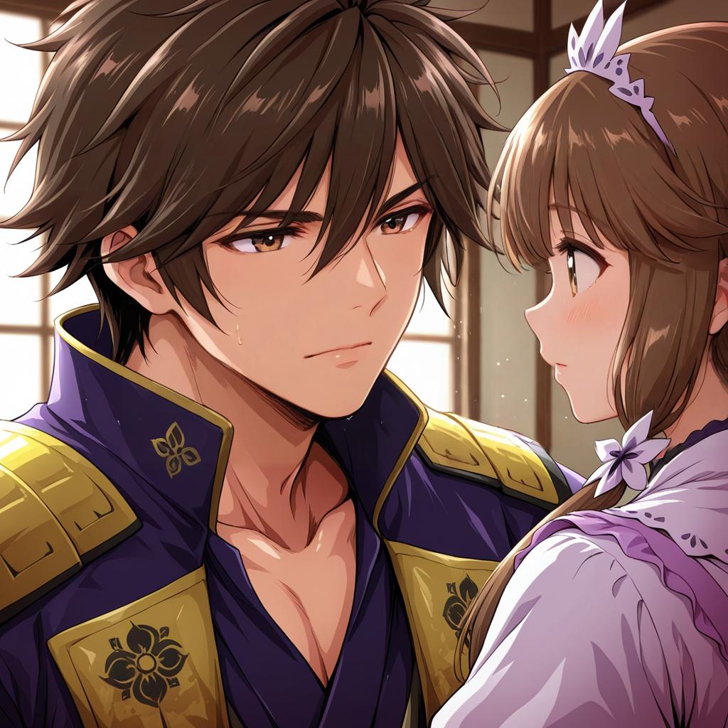 Mouri motonari (sengoku basara), sengoku basara, 1boy, brown eyes, brown hair, short hair, by artist marugoshi (54burger), dark_illustrious