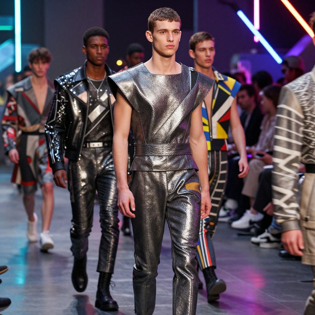 "Fashion Week real albino models, dressed in the style of Takashi Murakami, light orange, light rose, light green, light yellow, neon, and peach,"