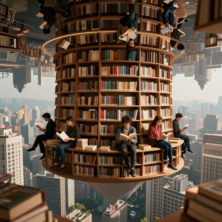 Digital artwork depicting a surreal cityscape with a massive, cylindrical, floating bookshelf suspended in mid-air. Six people, dressed in casual clothing, sit on various shelves, reading books. The bookshelf is filled with colorful, neatly arranged books. The background features a modern city with tall buildings and a bright, sunlit sky. The floating bookshelf is centered, with books and people creating a vibrant focal point. The style is a blend of realism and fantasy, with a warm, golden light illuminating the scene. The image conveys a sense of tranquility amidst an otherwise bustling urban environment.