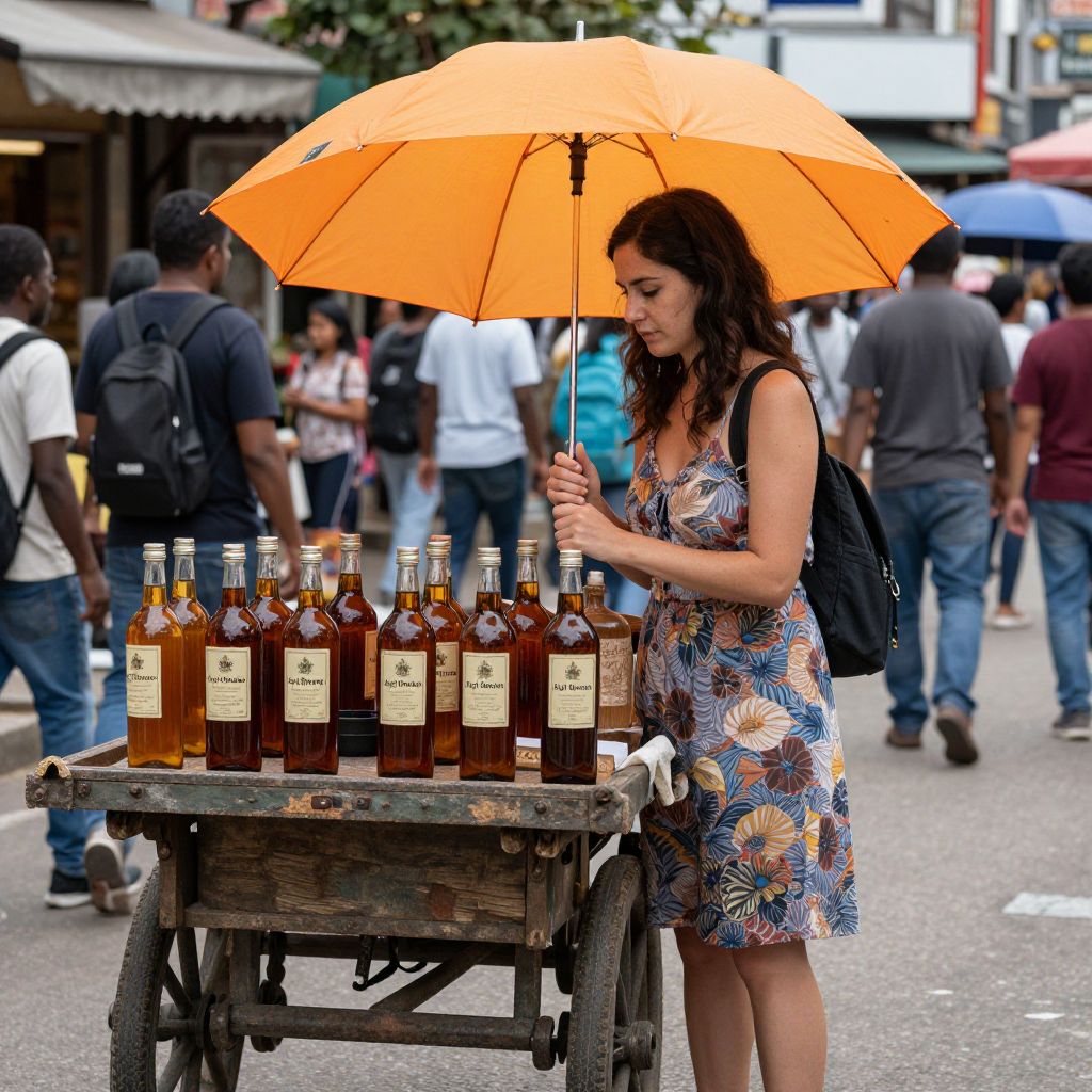 Photograph of a young woman with wavy dark brown hair, wearing a sleeveless, floral-patterned dress, standing on a bustling street. She holds an orange umbrella over a wooden cart filled with ten glass bottles of amber-colored liquid, each with a beige label. The woman has a black backpack and is looking down at the bottles. The background features a crowd of people in casual clothes, some with backpacks, walking past colorful storefronts and trees. The street is slightly blurred, emphasizing the woman and her cart in the foreground. The image has vibrant colors and a slightly high-contrast style.