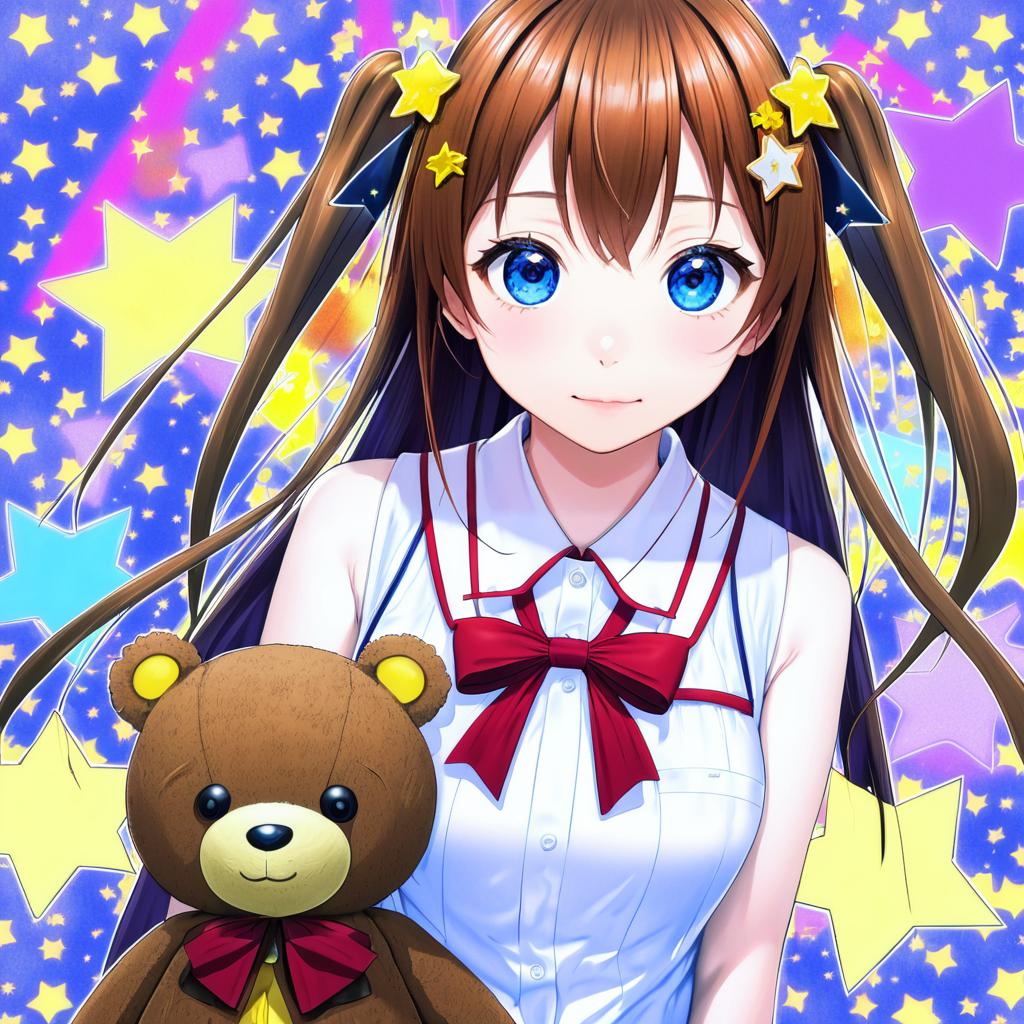 Ankimo (tokino sora), hololive, 1girl, blue eyes, hair between eyes, brown hair, long hair, star hair ornament, hair flaps, hair ribbon, hairclip, medium breasts, white shirt, pleated skirt, sleeveless shirt, red ribbon, virtual youtuber, virtual youtuber, teddy bear, by artist doko tetora, anime