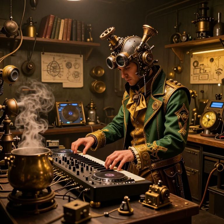 In this steampunk-themed laboratory, a DJ is engrossed in his craft, surrounded by an array of intricate machinery and tools. The scene is bathed in warm, golden light, casting a glow on the various components of the lab. The DJ, dressed in a green and gold jacket with intricate designs, is adorned with a headpiece that resembles a steampunk helmet, complete with goggles and mechanical components. His hands are deftly maneuvering a keyboard, which is part of a complex setup of instruments and gadgets. The background reveals shelves filled with books, diagrams, and other scientific paraphernalia, adding to the lab's cluttered yet organized appearance. A large, steaming pot sits on the table, hinting at the DJ's dual role as a musician and a scientist. The overall composition is dynamic, with the DJ at the center, surrounded by the tools of his trade, creating a masterful blend of technology and artistry.