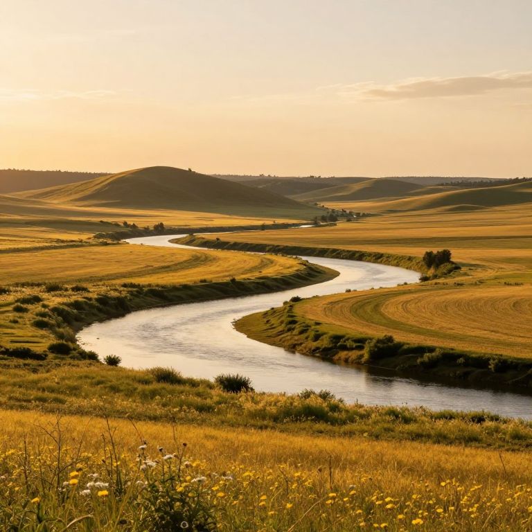 Winding river meanders through golden fields under a soft sunset sky, flanked by wildflowers and dotted with distant trees against rolling hills.