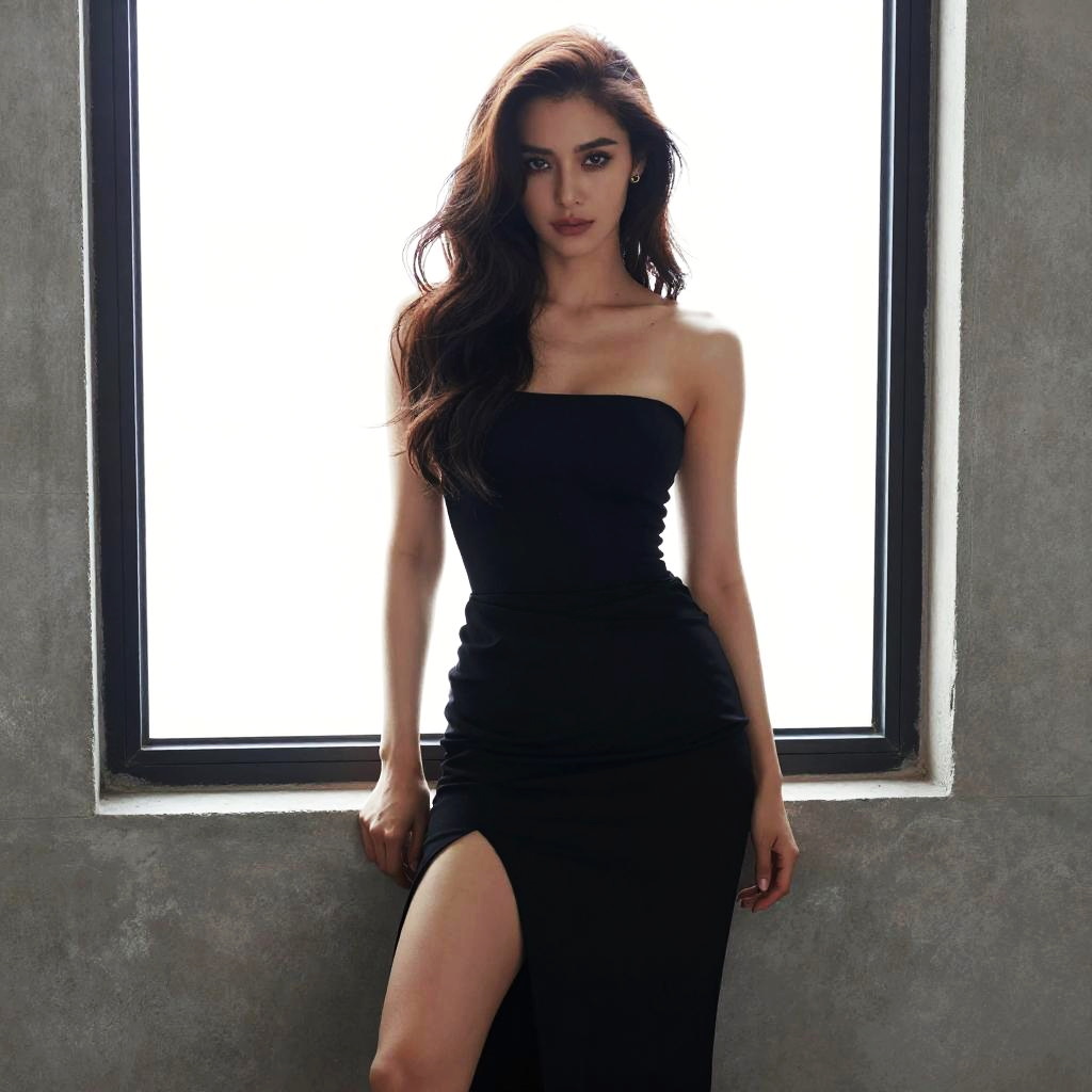 Photograph of a slender, young woman with long, wavy brown hair standing in front of a bright window. She has a fair complexion and is wearing a strapless, form-fitting black dress with a high slit on her left side, revealing her toned leg. She stands with her right hand resting on the window frame, exuding confidence. The background is a textured gray wall, and the window's bright light creates a stark contrast with her dark dress. Her expression is serious, and she gazes directly at the camera. The overall style is modern and minimalist.