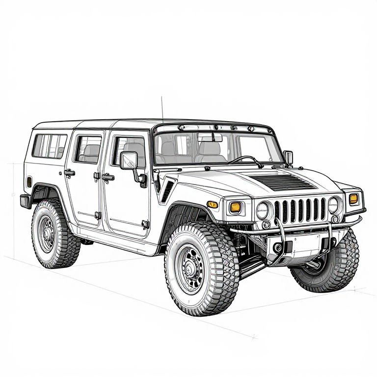 "Peel And Stick wireframe line illustration of an h1 hummer, technical, three quarters angle, blueprint, drawing, b&w, transparent,"