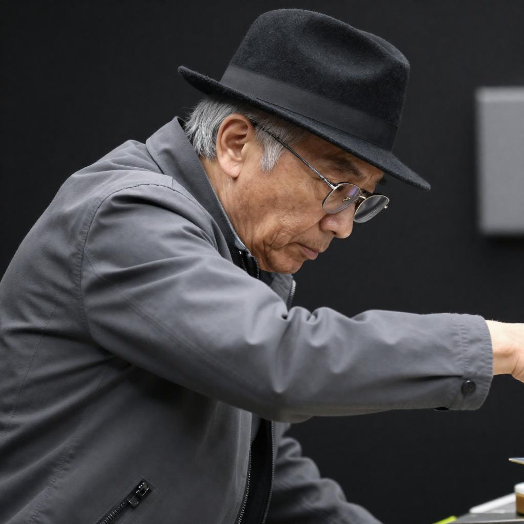 Middle-aged man with gray hair, glasses, and black hat, wearing a gray jacket, leaning forward intently with right arm extended. Dark background with a metallic object on the right. Photograph.