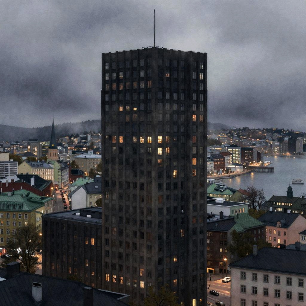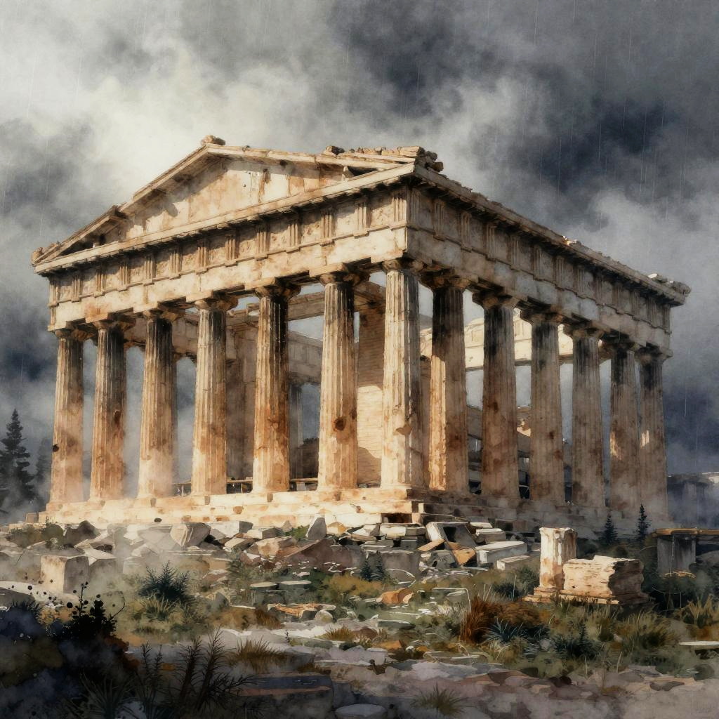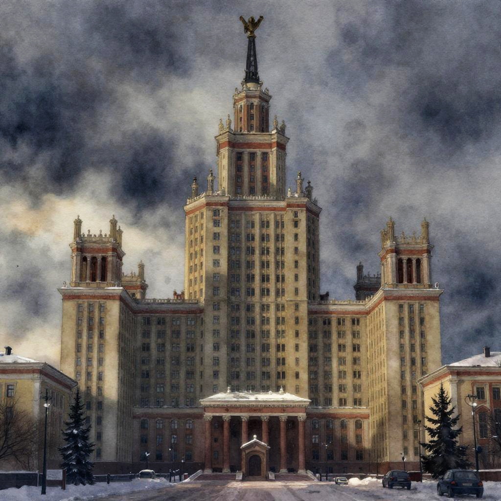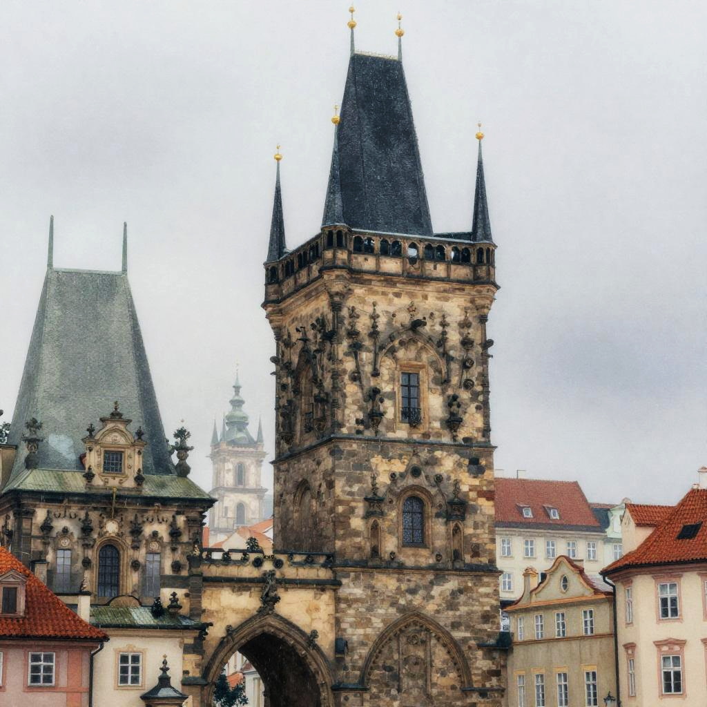 Watercolor illustration of an impossibly high baroque tower in misty Prague, at early morning with fog and light drizzle. Cool muted shades, ornate details, melancholic and mysterious mood, rich and elaborate.