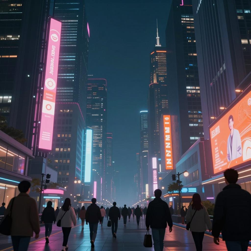 A digital illustration of a bustling futuristic city street at night filled with numerous people walking. The scene features tall skyscrapers adorned with vibrant neon lights in shades of pink, blue, and orange, creating a cyberpunk atmosphere. The cityscape fades into a glowing, misty horizon.
