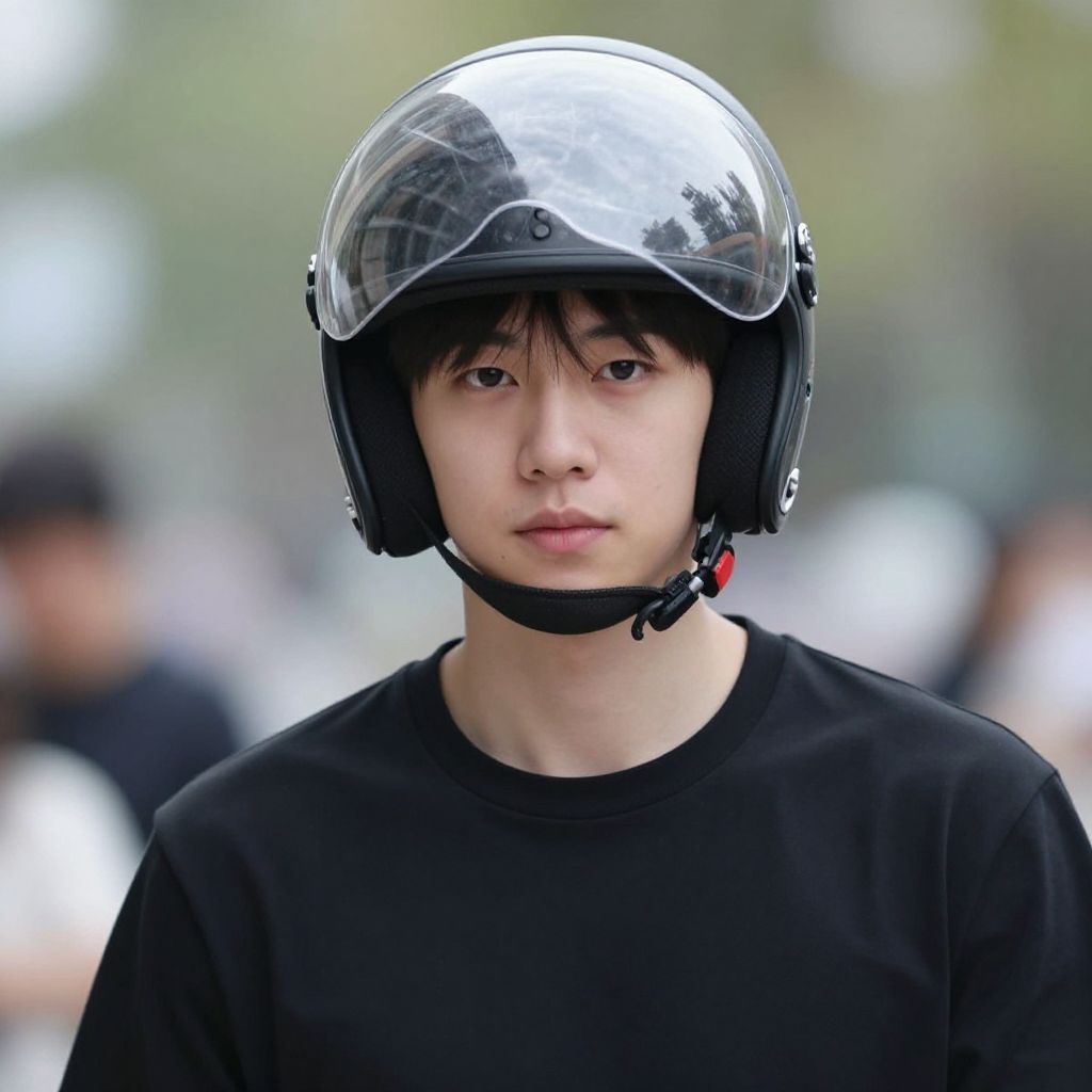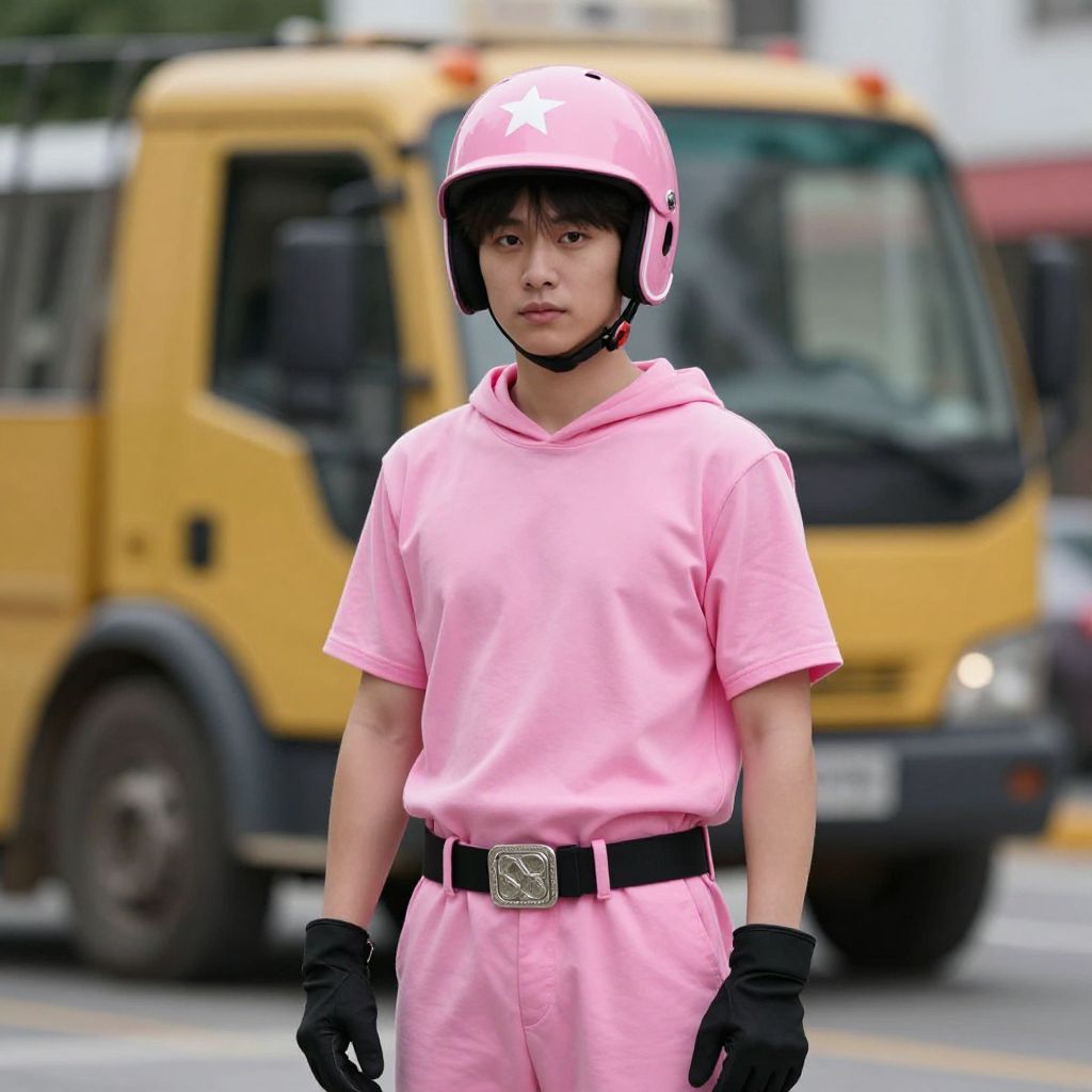 "pink construction costume, 1boy, solo, male focus, gloves, blurry background, outdoors, blurry, hood, looking at viewer, building, black gloves, realistic, helmet, belt, city, motor vehicle, street, standing, cowboy shot Realistic photo of casual sexy person with pretty face"