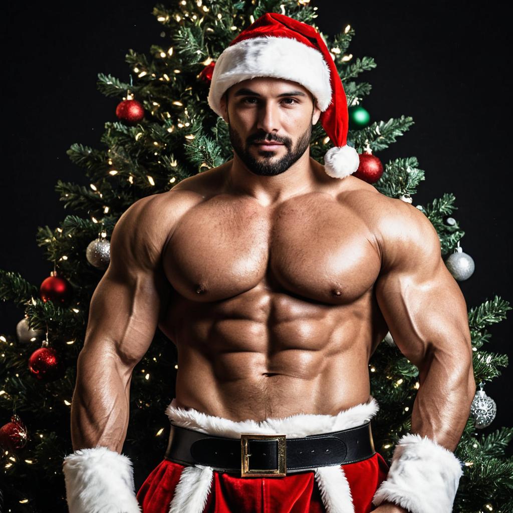 A muscular man wearing a red Santa hat, Santa pants with a black belt, and white fur gloves stands shirtless in front of a decorated Christmas tree. He has short dark hair, a beard, and a confident expression, showcasing well-defined pectorals and abs. The Christmas tree behind him is adorned with multicolored ornaments and lights on a dark background.