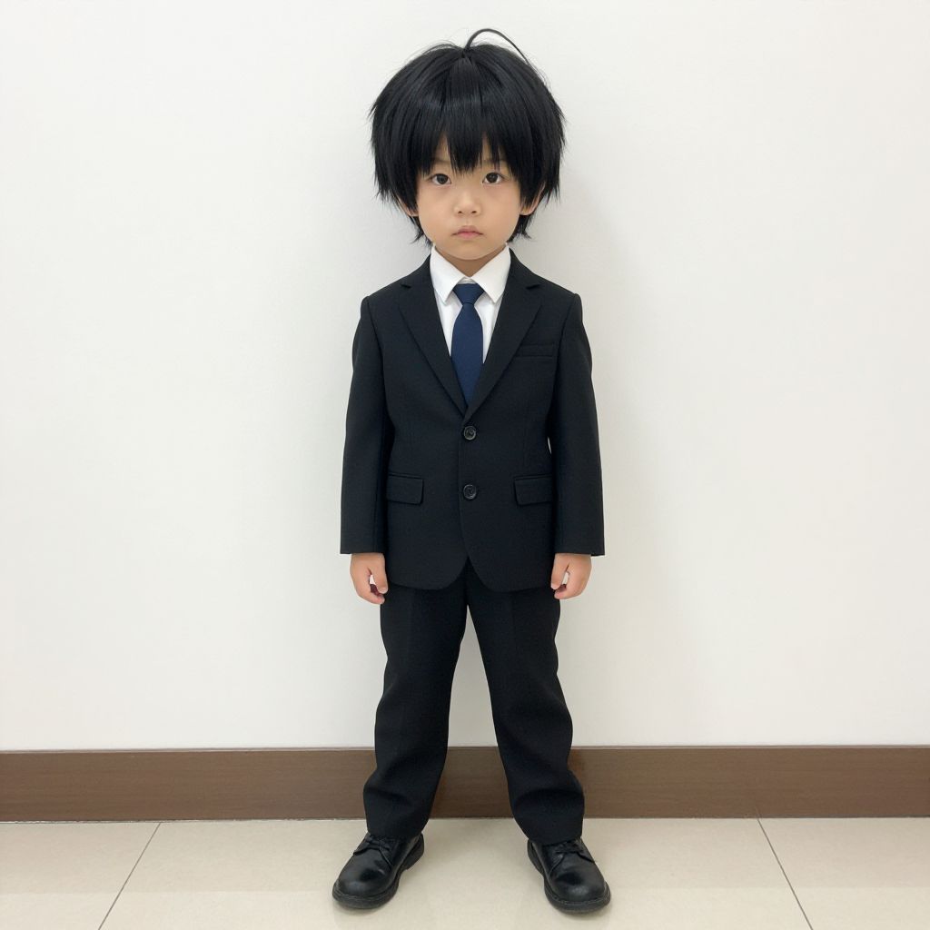 Photograph of a young Asian boy with black, tousled hair standing against a white wall with a brown baseboard. He is dressed in a small, black, formal suit with a white shirt and black tie, and black dress shoes. His expression is neutral, and his hands hang by his sides. The floor is tiled in a light cream color. The boy is centered in the image, and the overall lighting is bright, emphasizing the contrast between his dark suit and the white background.