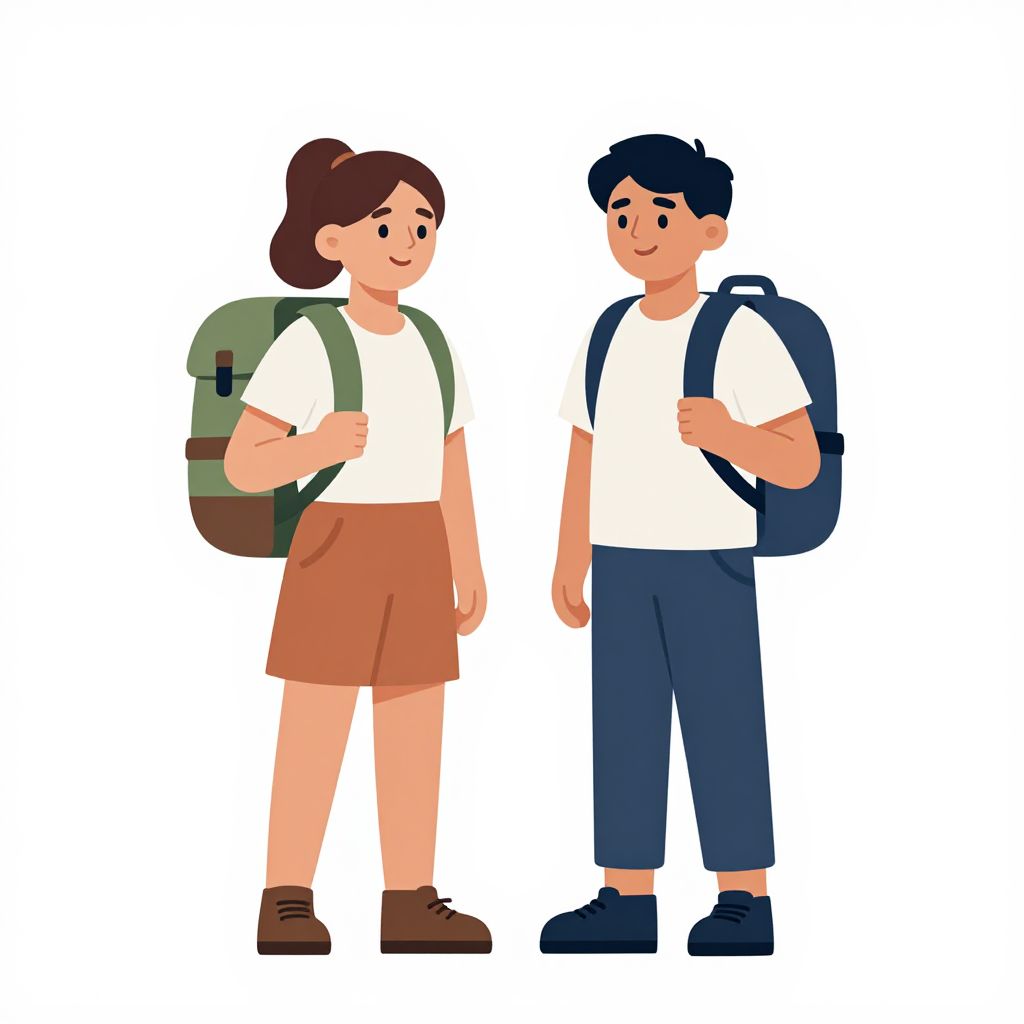 Digital illustration of a smiling couple standing side by side, both wearing backpacks and casual clothes, against a white background.