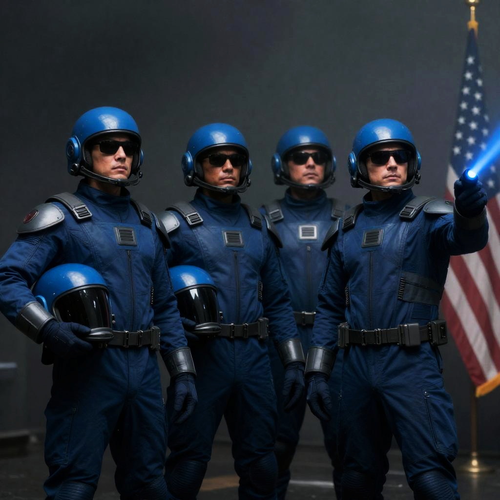 Photograph of four men in futuristic suits with blue helmets, standing in a dark, misty environment. Three men on left hold helmets, one man on right points a blue light beam. Men wear dark sunglasses, serious expressions. Foggy background, American flag partially visible on right.