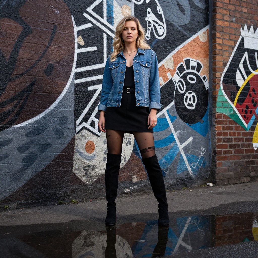 Street chic aesthetics, european woman, standing in front of a mural-covered brick wall, wearing a denim jacket, ripped stockings, and knee-high boots, with a cityscape reflected in a puddle at her feet, dramatic lighting, realistic photography, high contrast, cinematic