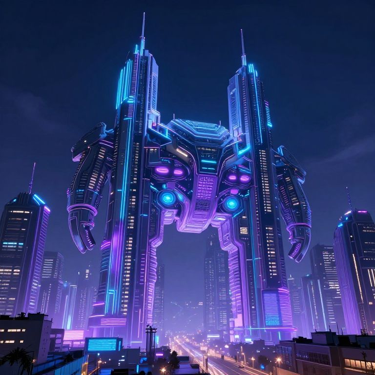 Futuristic cityscape featuring towering structures shaped like mгёches, neon blue and purple hues illuminating the night sky, reflective surfaces and holographic elements, cyberpunk style, ultra-detailed environment