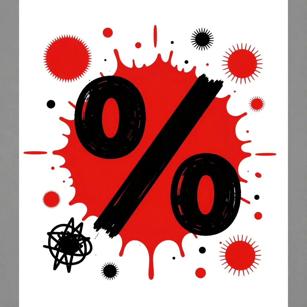 This is a digital abstract art piece featuring bold red and black splashes on a white background. The large black percentage symbol dominates the center, surrounded by various red circles, dots, and brush strokes. Black scribbles and symbols are scattered throughout, adding a chaotic feel. The left and right edges are framed in gray, creating a striking contrast.