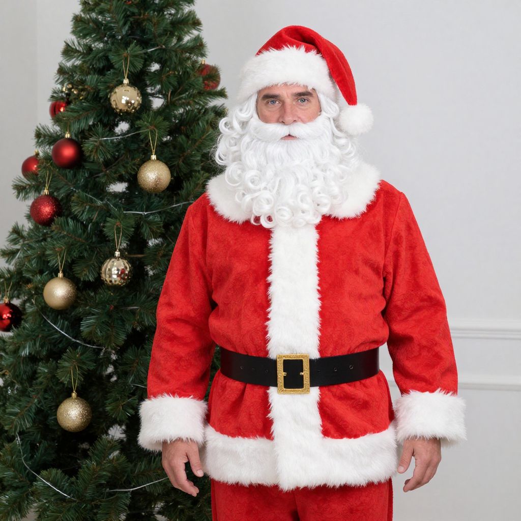 Pro Santa Suit Costume, santa claus is posing for a picture in front of a christmas tree
