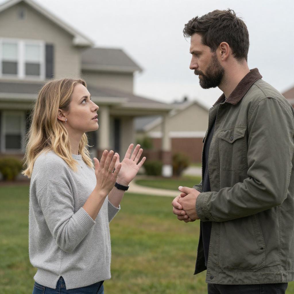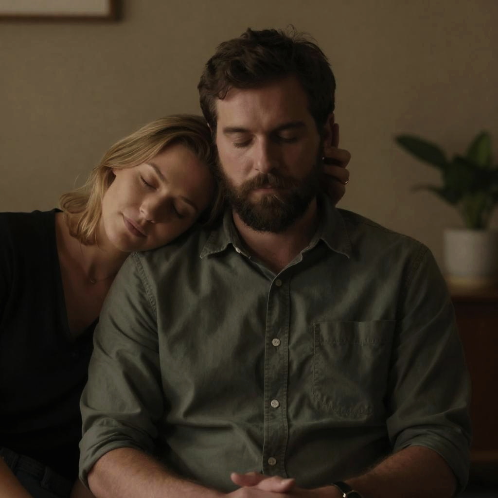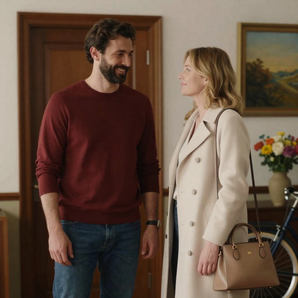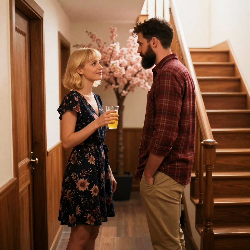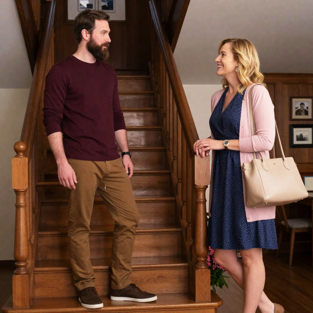 Photograph of a wooden staircase. A bearded man in a maroon long-sleeve shirt and brown pants stands on the left. A smiling woman with blonde hair, wearing a pink cardigan, blue patterned dress, and beige handbag, stands on the right, holding the railing. A small plant with pink flowers is near the base of the stairs. The man looks at the woman. The background includes wooden paneling and framed pictures on the wall.