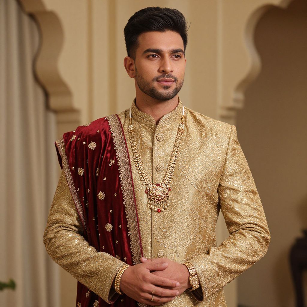 "Shubh Vivah Ethnic Groom Wear, a man in a red and gold sherwani with a necklace and a necklace"