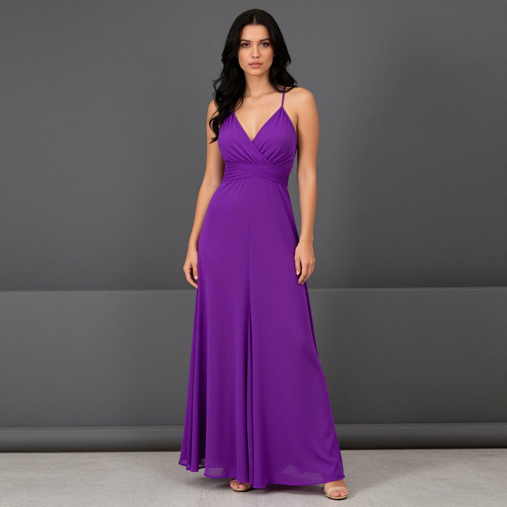 Photograph of a woman with long, wavy black hair standing against a solid dark gray background. She is wearing a floor-length, sleeveless purple dress with a deep V-neck and a gathered waistline, which flows gracefully to the floor. Her skin tone is light, and she has a serious expression. She stands with her arms relaxed by her sides, and her feet are slightly apart. The dress has a soft, flowing fabric texture, and she is wearing nude-colored high-heeled sandals. The lighting is even, highlighting the rich purple color of the dress.