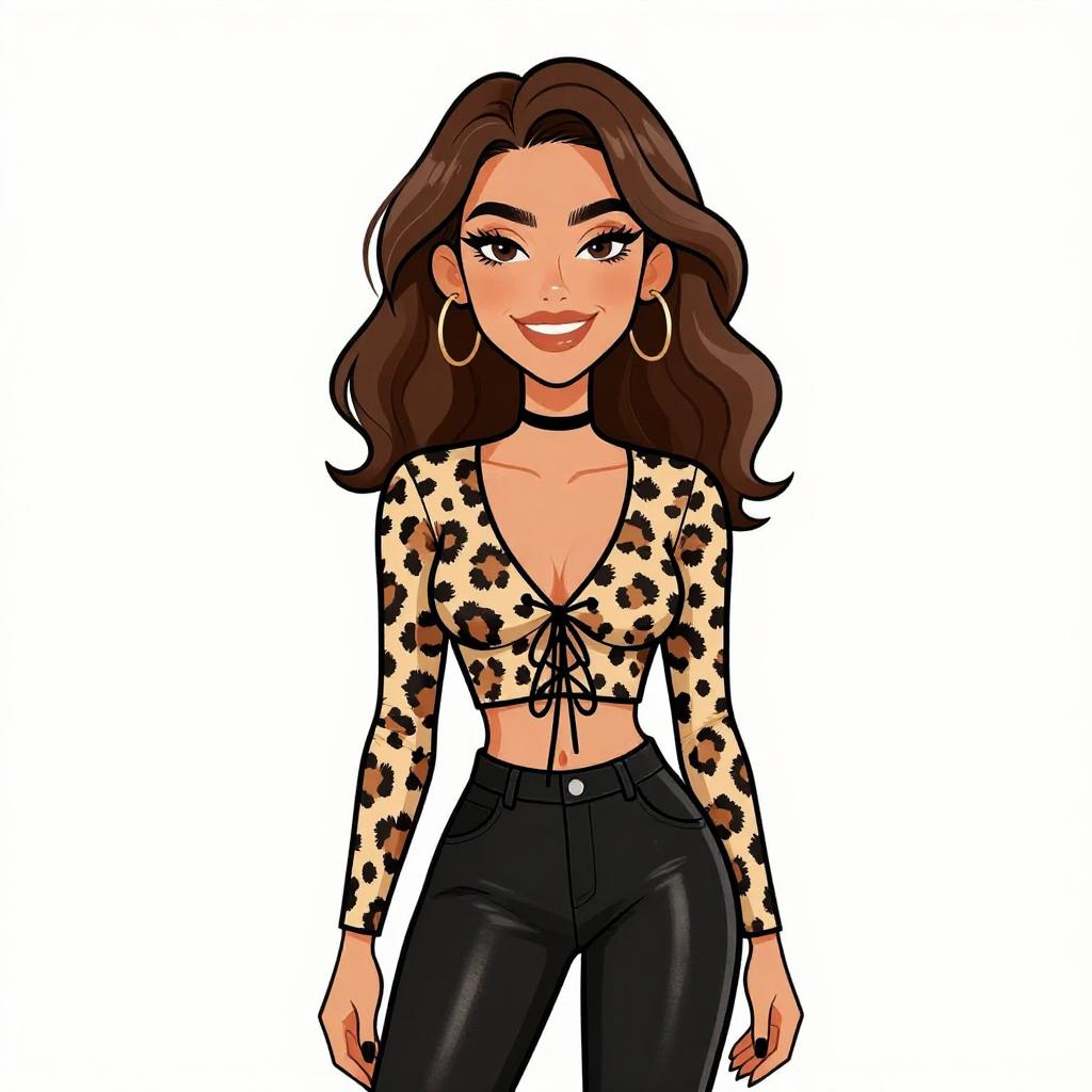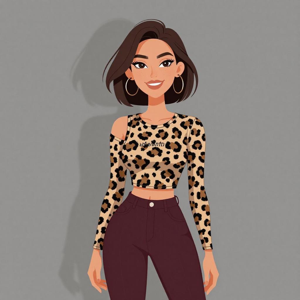 Woman with pretty face and pretty hair. smiling Woman, casual, leopard print top with cut-out detail, long sleeves, round neck, graphic print with text, slim-fit burgundy trousers, mid-rise waist. --sref 1467