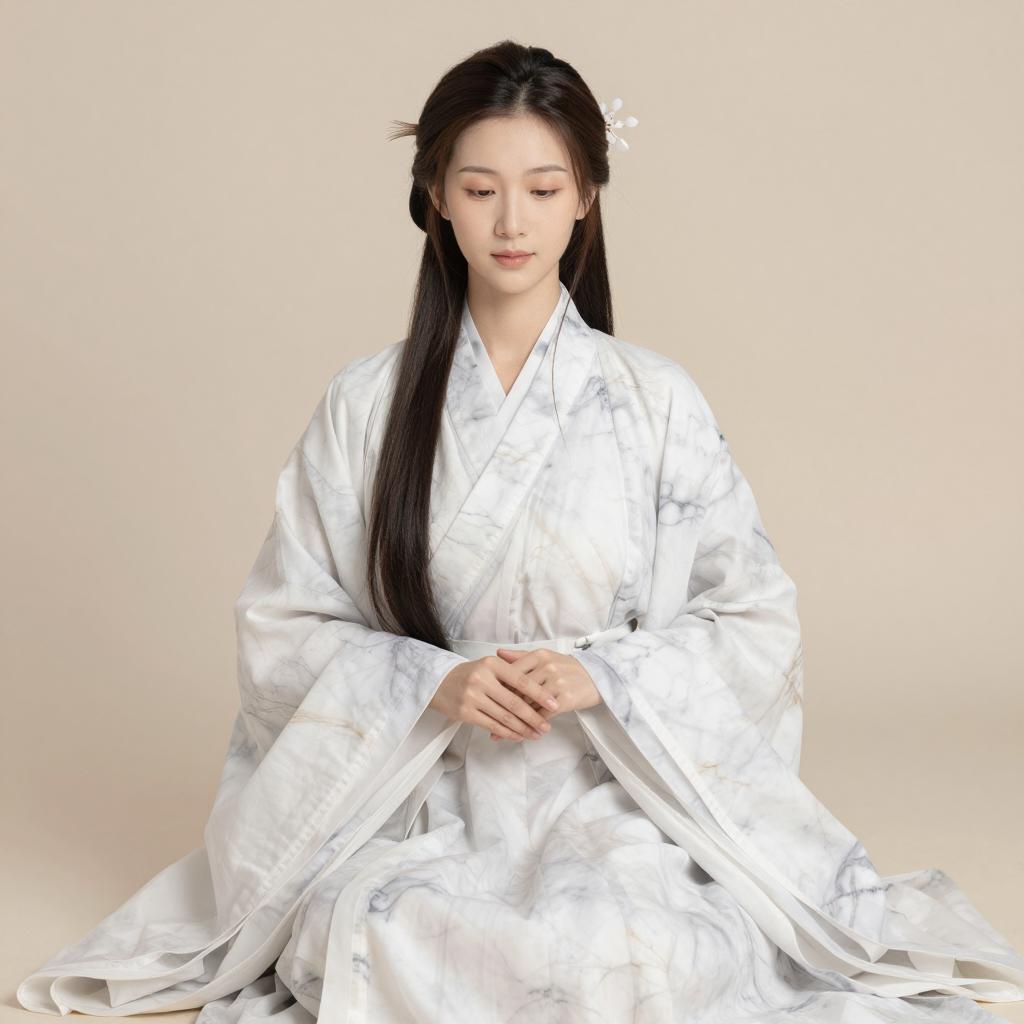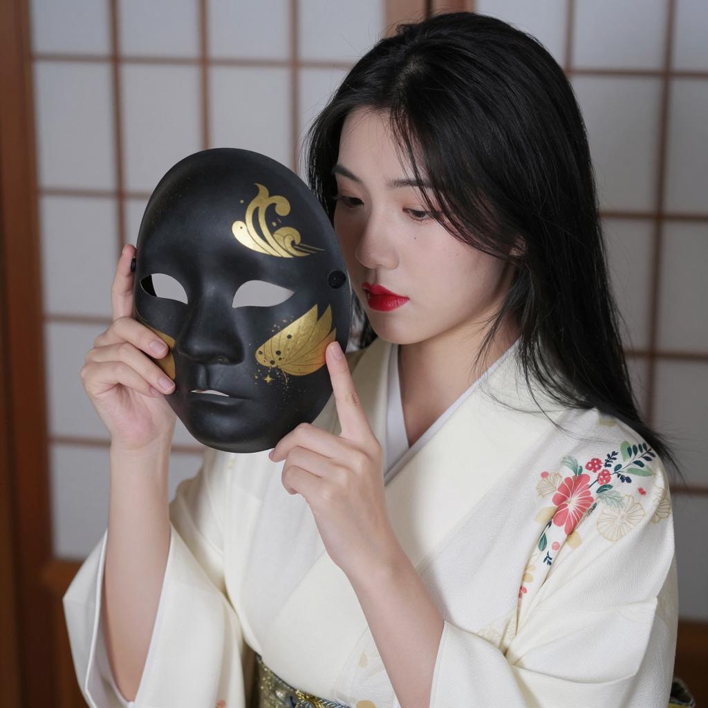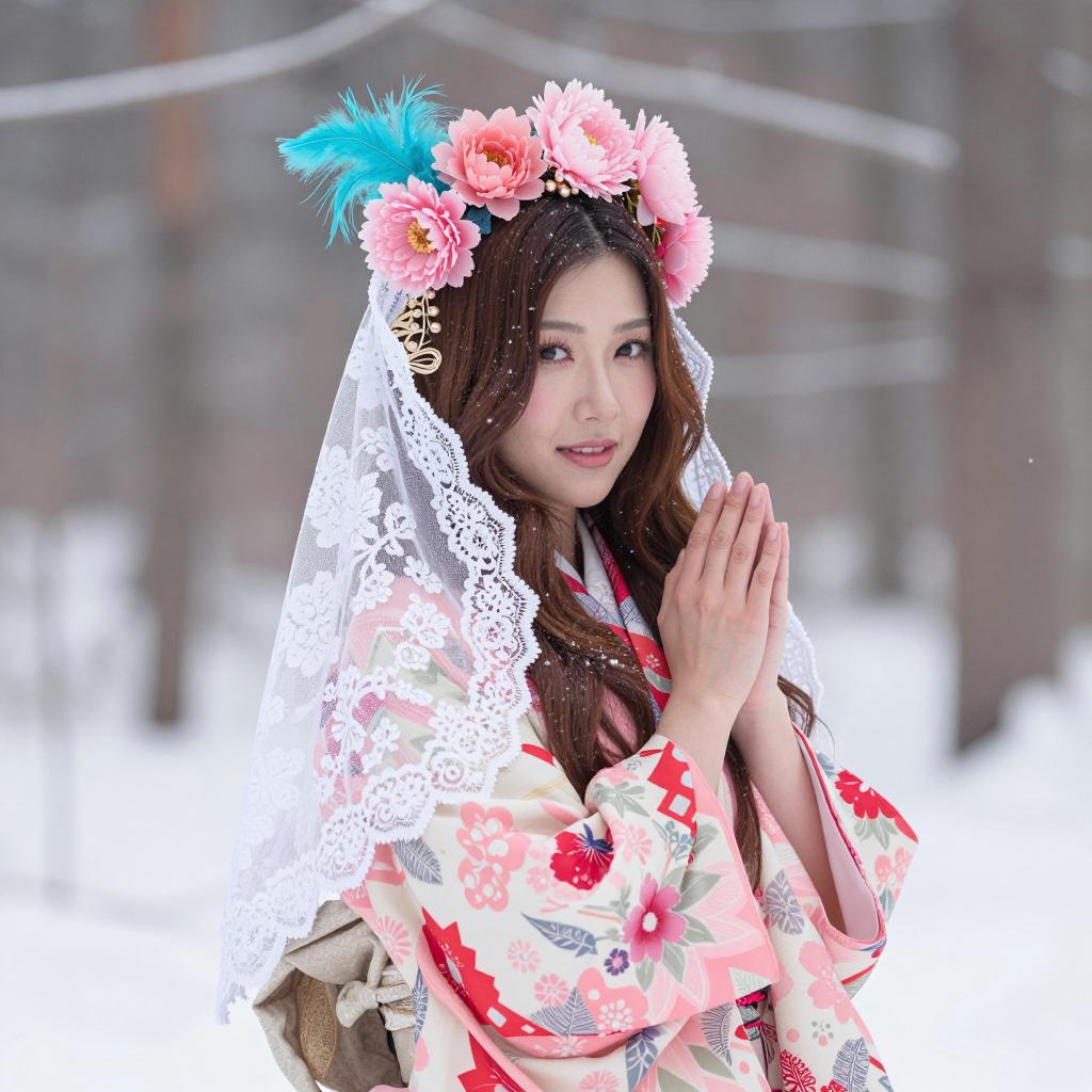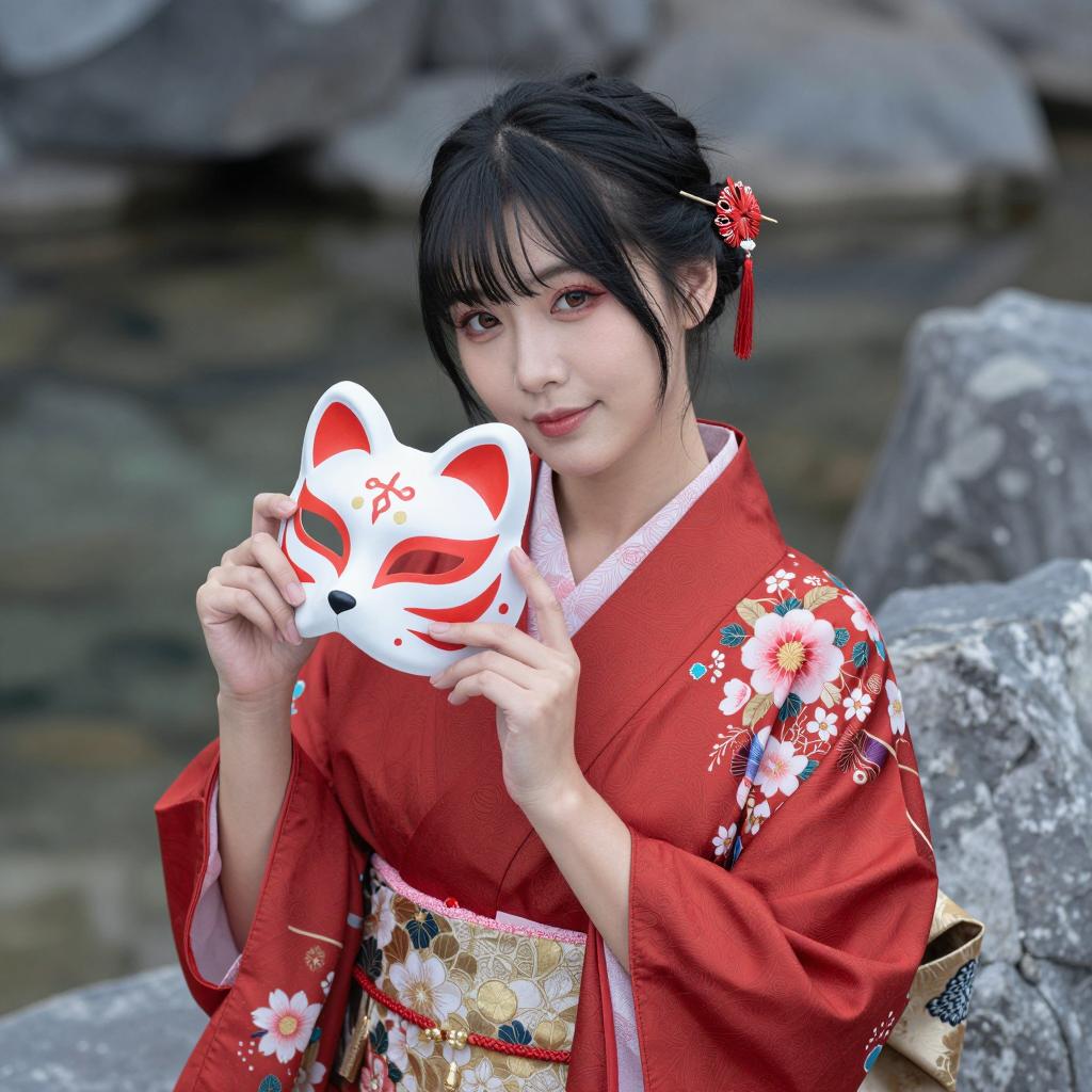 East Asian woman with long brown hair, white floral hairpin, closed eyes, wearing a white embroidered kimono with black floral patterns, holding a small decorative box, standing among large rocks, cloudy sky background.