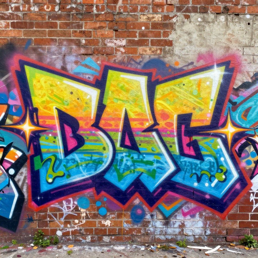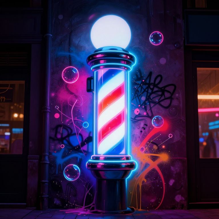 Vibrant graffiti on a weathered brick wall featuring a bold, silver barber pole with red and white stripes, surrounded by colorful splashes and abstract