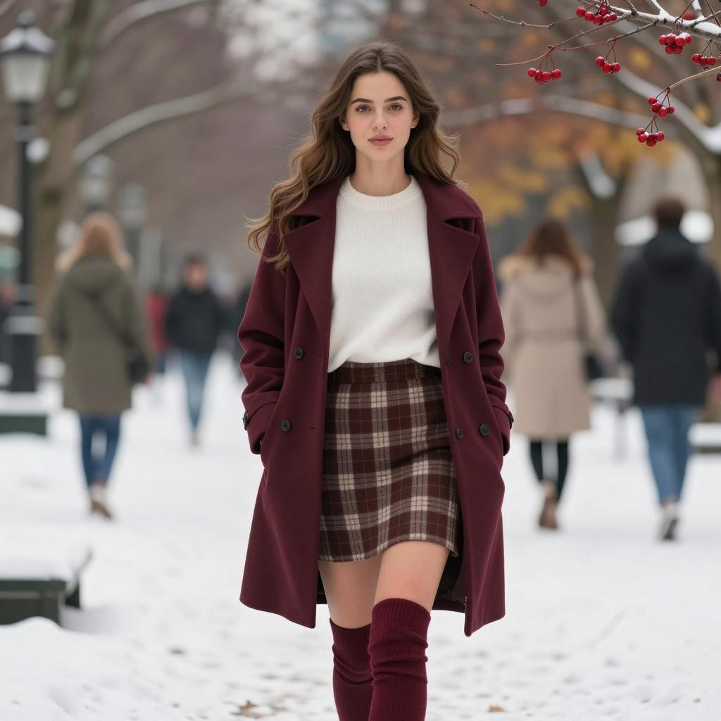 Trendy sweaters costume, photorealistic, street fashion, model, brunette woman, high bun, serious expression, oversized beige ribbed turtleneck sweater, long sleeves, hands in pockets, green backpack, knee-length, bare legs, brown thigh-high boots, blurred crowd background, winter clothing, red coat in background, daytime, urban setting, shallow depth of field, natural light, realistic ures, casual style, fashionable, confident stance