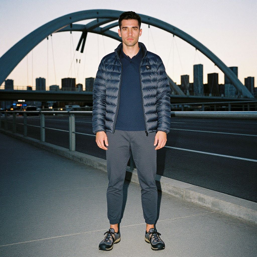 A man, breathable polo shirt, tapered jogger pants, slip-on trail shoes, insulated packable jacket, classic navy and gray palette, modern steel arch bridge, city skyline in the background, vibrant sunset casting shadows, disposable camera style, relaxed expression. Man has masculine face and piercing eyes