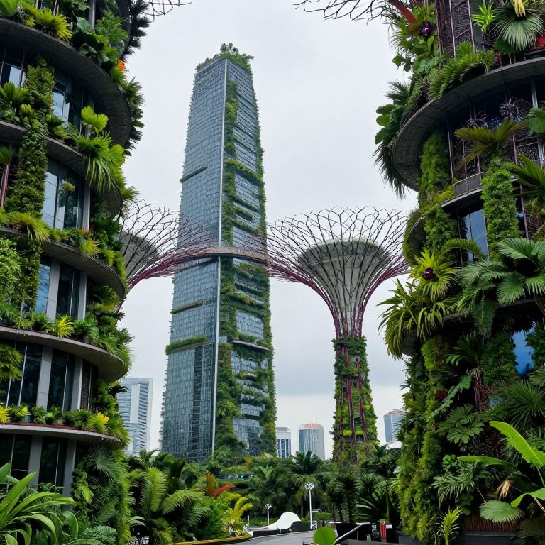 Photograph of a modern, green-clad skyscraper with a tree-like archway, flanked by lush, vertically-gardened buildings, in