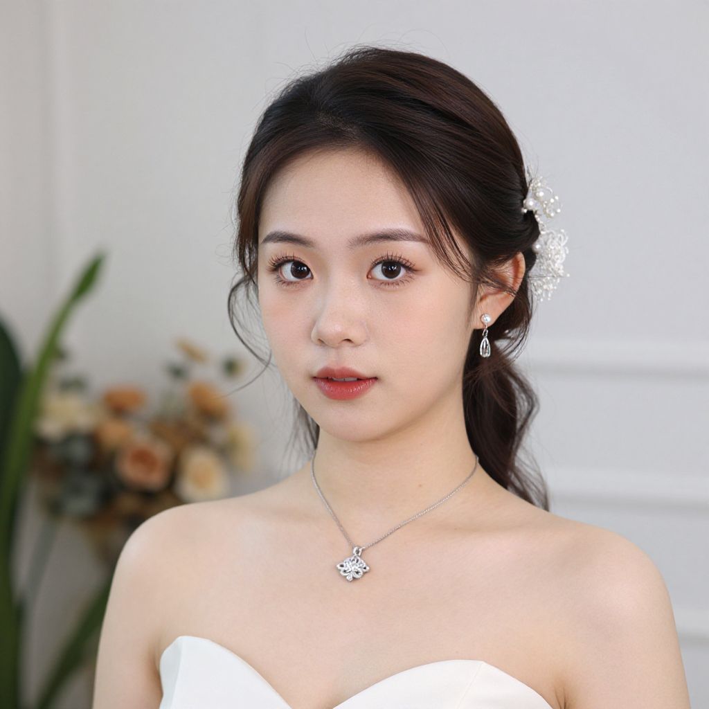 Photograph of an Asian woman with fair skin and dark hair styled in an elegant updo, adorned with a delicate floral headband. She has red lipstick and wears matching floral earrings. Her dress is a satin pink with white lace trim on the neckline and sleeves. The background is a soft-focus floral pattern with pink roses, adding a romantic and delicate feel to the image. The woman's expression is calm and poised, with subtle makeup highlighting her natural beauty. The overall style is classic and elegant.