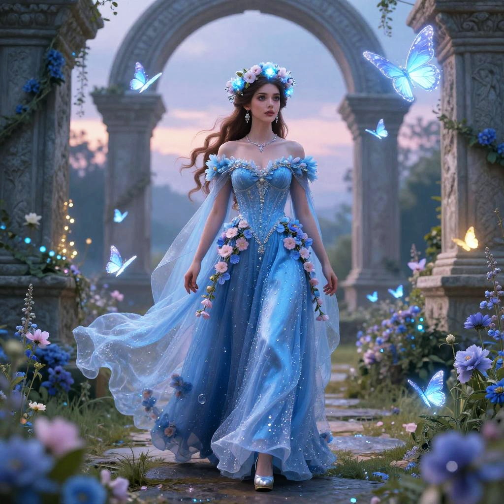 A digital fantasy artwork depicts a fair-skinned, brown-haired woman with a crown of blue flowers, wearing an off-shoulder, blue, sparkly gown adorned with pink flowers and a translucent veil. She stands in a magical garden with glowing blue butterflies, surrounded by blooming purple and pink flowers, under an ancient stone archway at dusk. The background shows a twilight sky with soft pink and purple hues. Her expression is serene, and she wears white high heels. The image exudes a fairy-tale, ethereal vibe with a focus on delicate, magical elements.